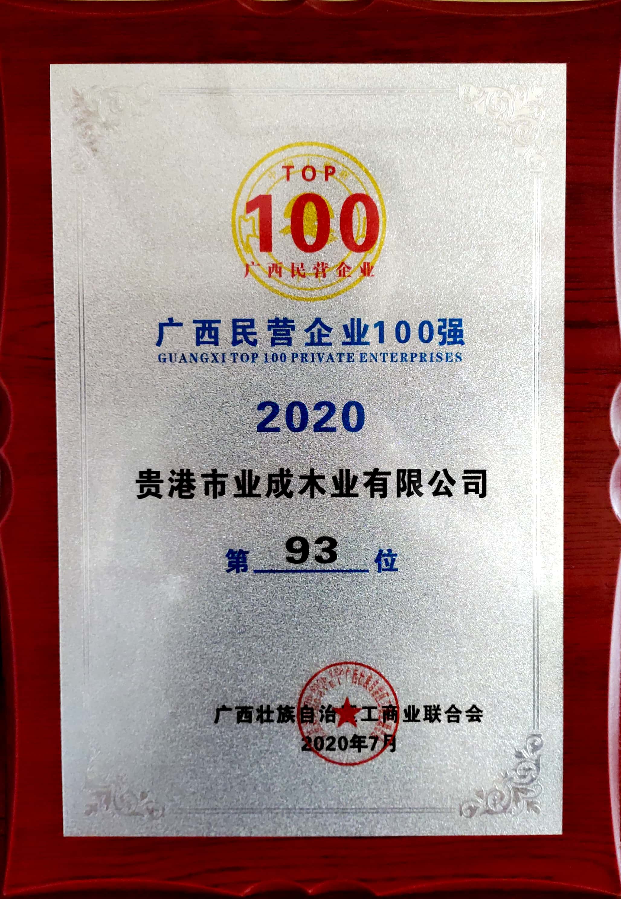 业成集团目前为广西同行中产销量领先的民营企业,母公司贵港市业成木业有限公司业绩领先:2015年12月通过了ISO9001国际质量认证;2017入围全国工商联上规模民营企业,2017~2019年获得自治区农业产业化龙头企业;2017~2019连续三年进入广西“百强民营企业”行列;目前是贵港市港南区林业产业行业协会会长单位。